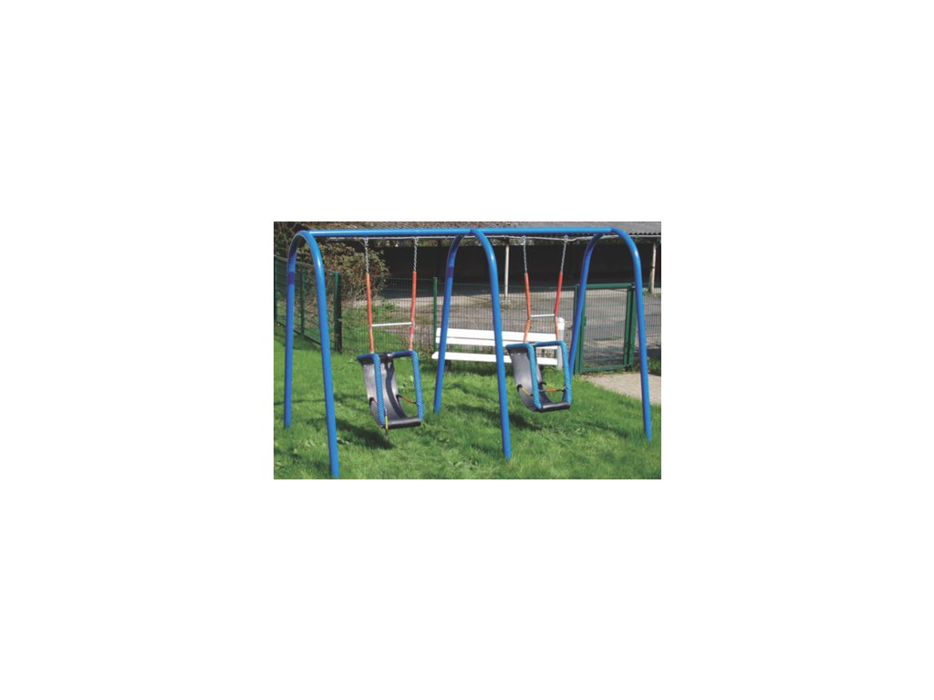 Leagan dublu din otel zincat la cald, vopsit in camp electrostatic si scaun din cauciuc cu insertie textila.