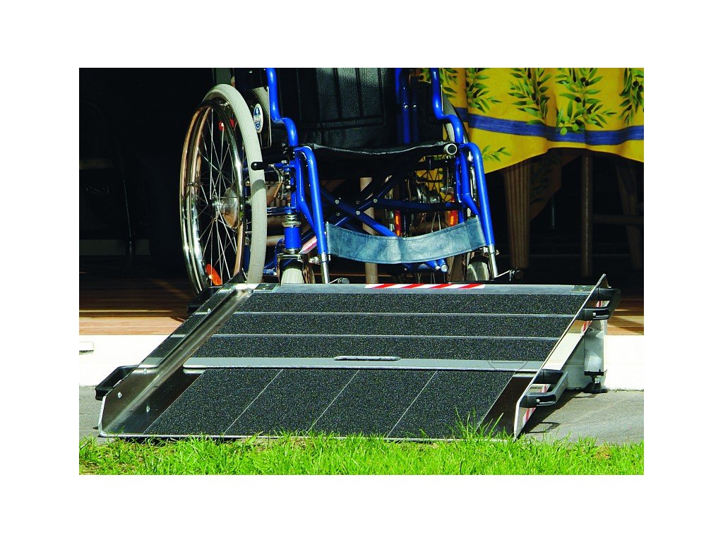 Rampa construita din doua parti, din aluminiu, cu margini laterale de protectie. Inaltimea picioarelor de sustinere este reglabila si are balamale pliabile. Non-alunecare de suprafata si rezistenta mare in timp. Nu necesita intretinere.