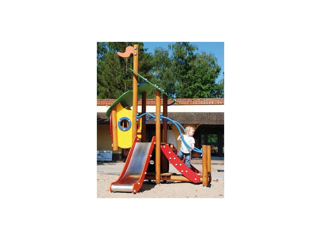 Complex de joaca pentru copii cu varste de 2-6 ani, cu 3 platforme, 1 tobogan, panou de catarare si scara.