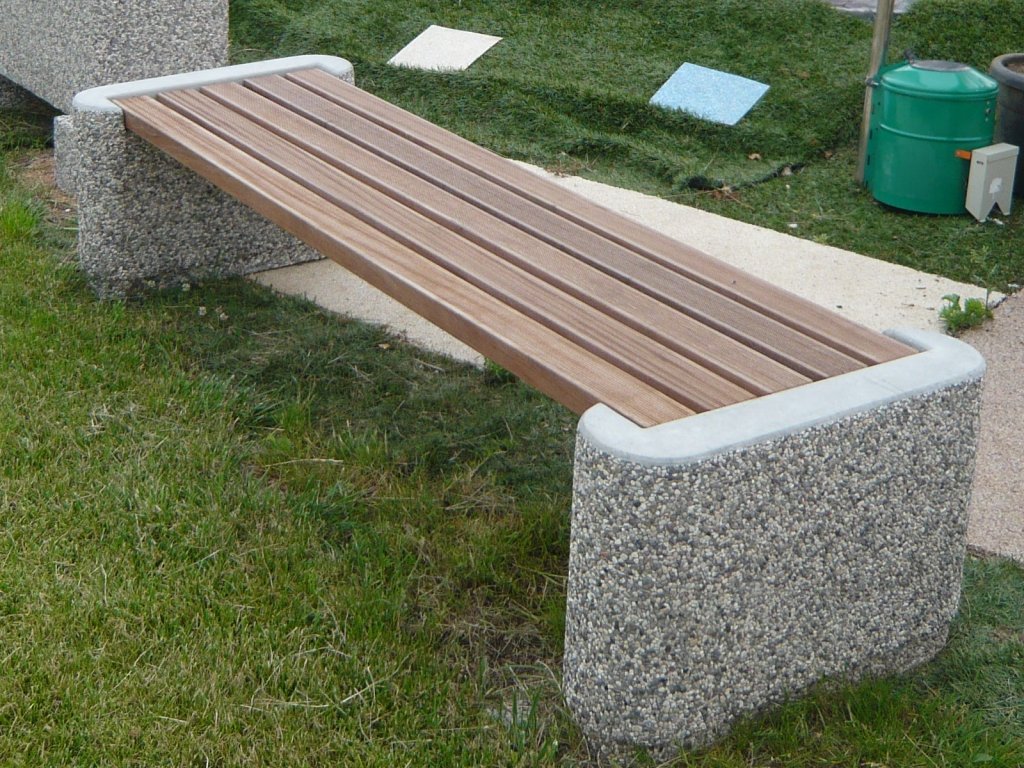 Banca cu picioare din beton armat si sezut din elemente de lemn.