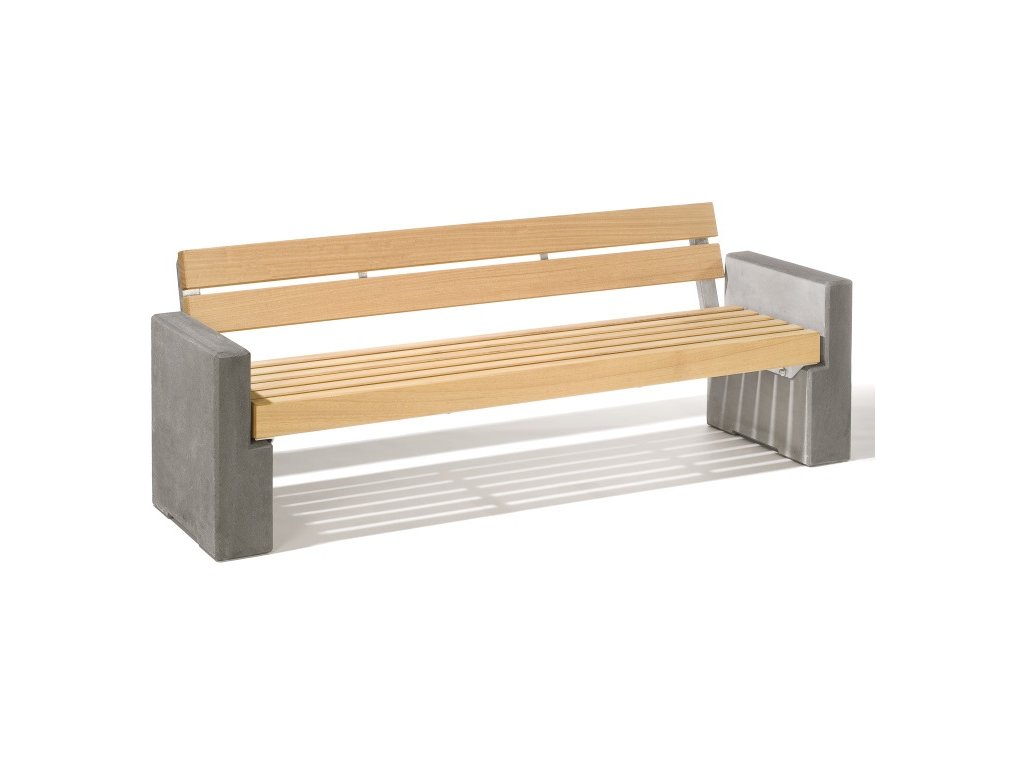 Banca cu laterale din beton, gri-deschis, cu sipci de lemn.