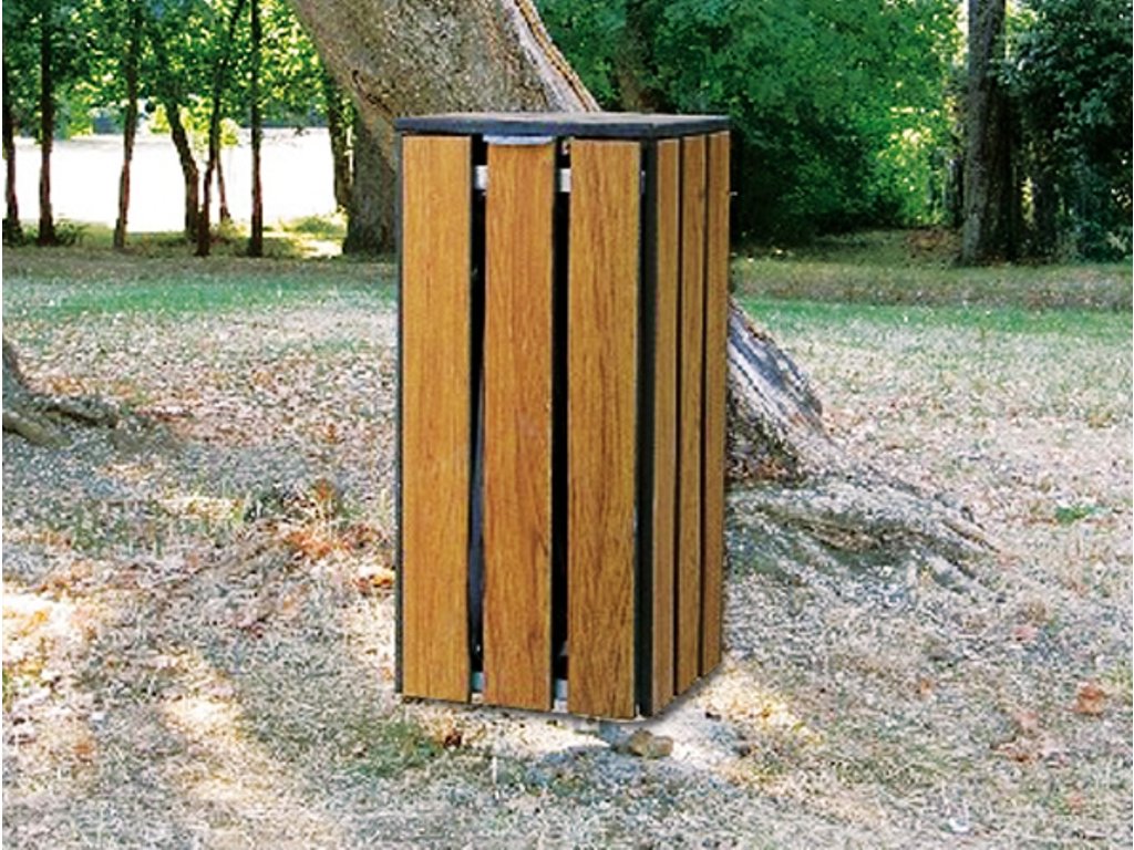 Cos parc din oțel zincat la cald si imbracat cu lamele Compact cu grosime de 14mm. Este prevazut cu un inel pentru sac de gunoi. Optional cu capac de protectie.