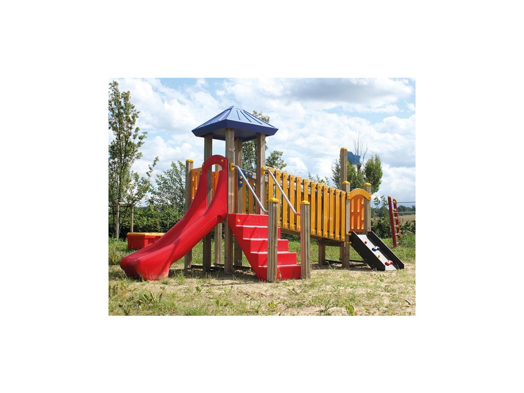 Combinatie de turn cu elemente de catarare si tobogan, potrivita pentru copii mici.