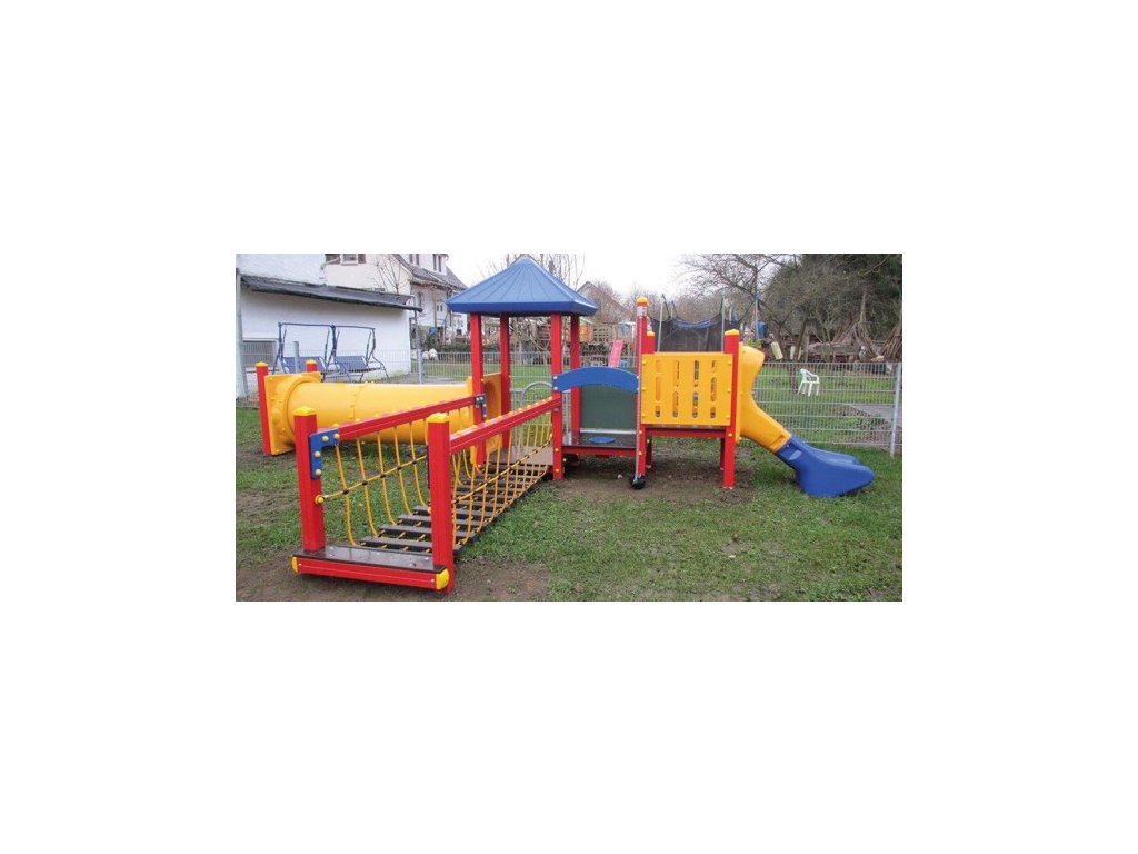 Combinatie de turn cu elemente de catarare si tobogan, potrivita pentru copii mici.