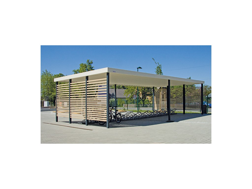 Constructie de otel zincat la cald. Sustineri din teava dreptunghiulara. Rama acoperisului din profil de cant autoportant (inaltime 140 mm) cu tabla trapezoidala in partea inferioara.