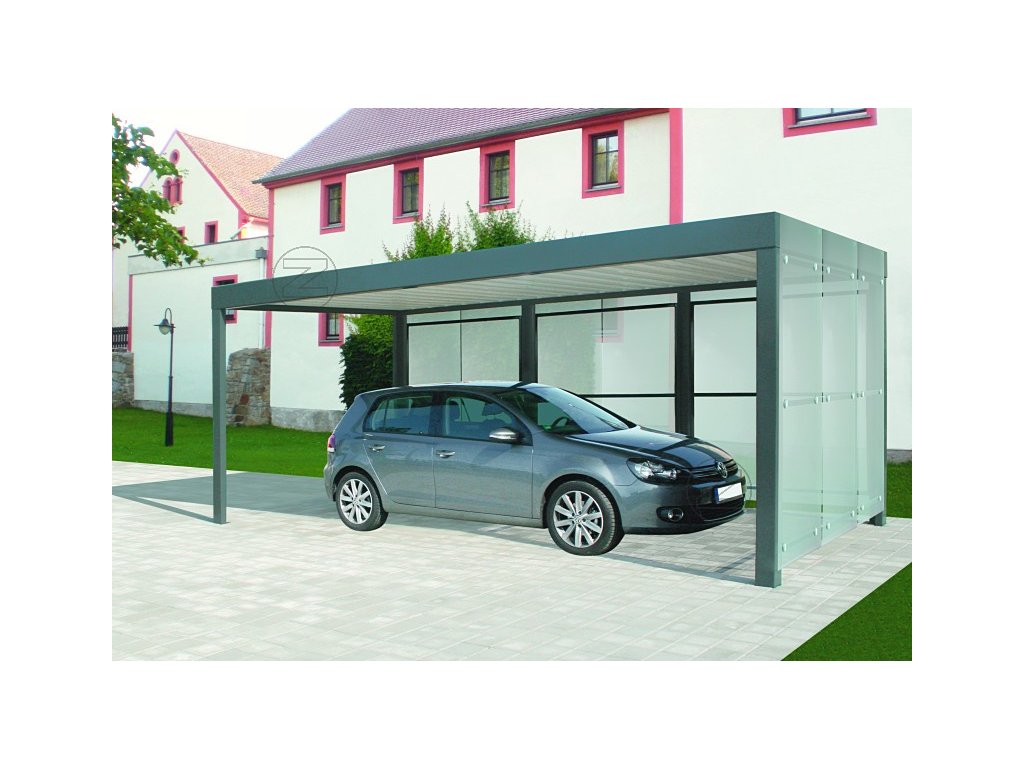 Acoperis cu culisa pe 1 parte sau pe 2 parti, rama acoperisului autoportanta, cu tabla trapezoidala in partea inferioara si vospita suplimentar gri-alb RAL 9002, inaltimea ramei acoperisului 140 mm.