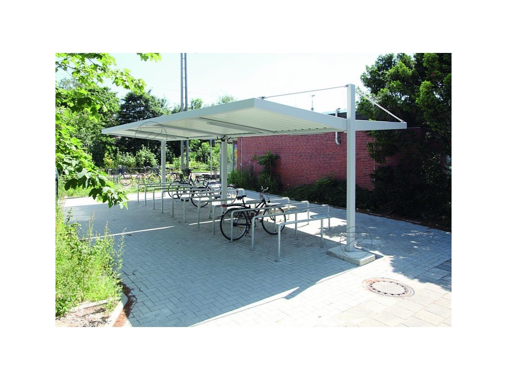 Acoperis cu culisa pe 1 parte sau pe 2 parti, rama acoperisului autoportanta, cu tabla trapezoidala in partea inferioara si vospita suplimentar gri-alb RAL 9002, inaltimea ramei acoperisului 140 mm.