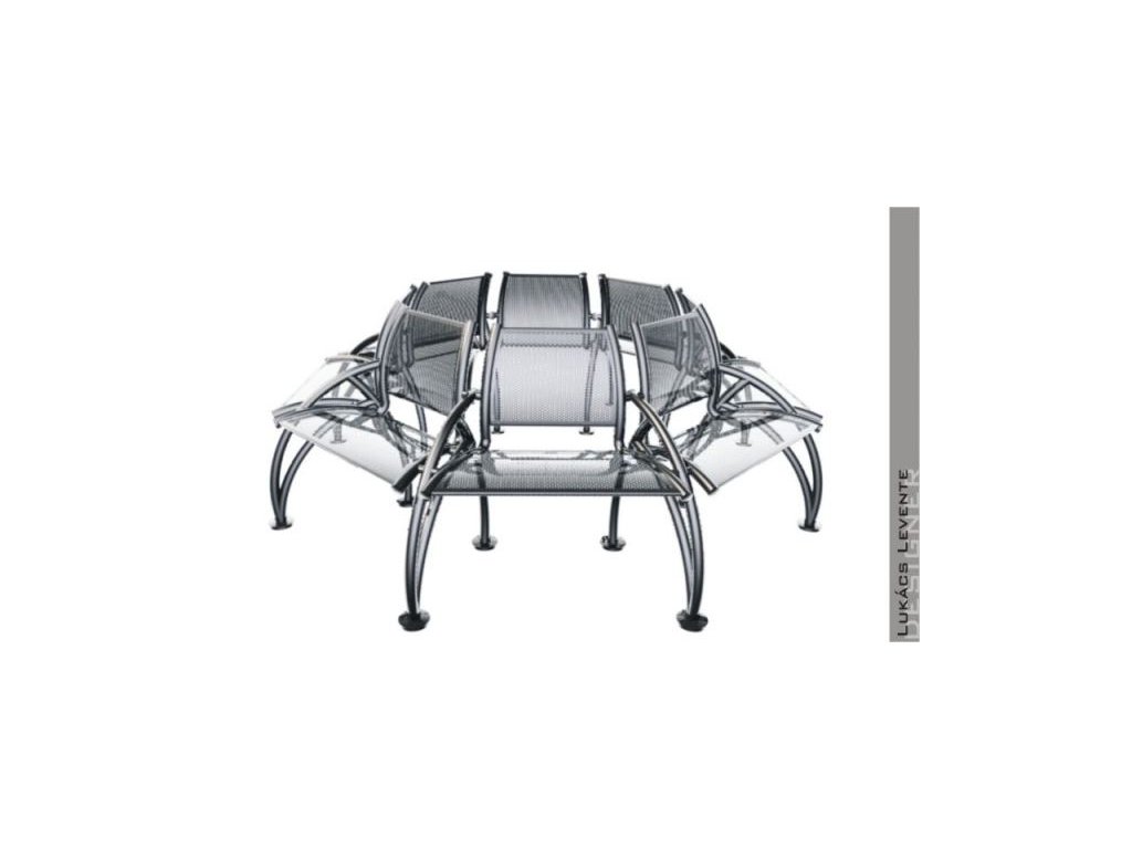 Banca din otel. Suprafata de sezut si spatarul sunt din tabla de otel perforata.