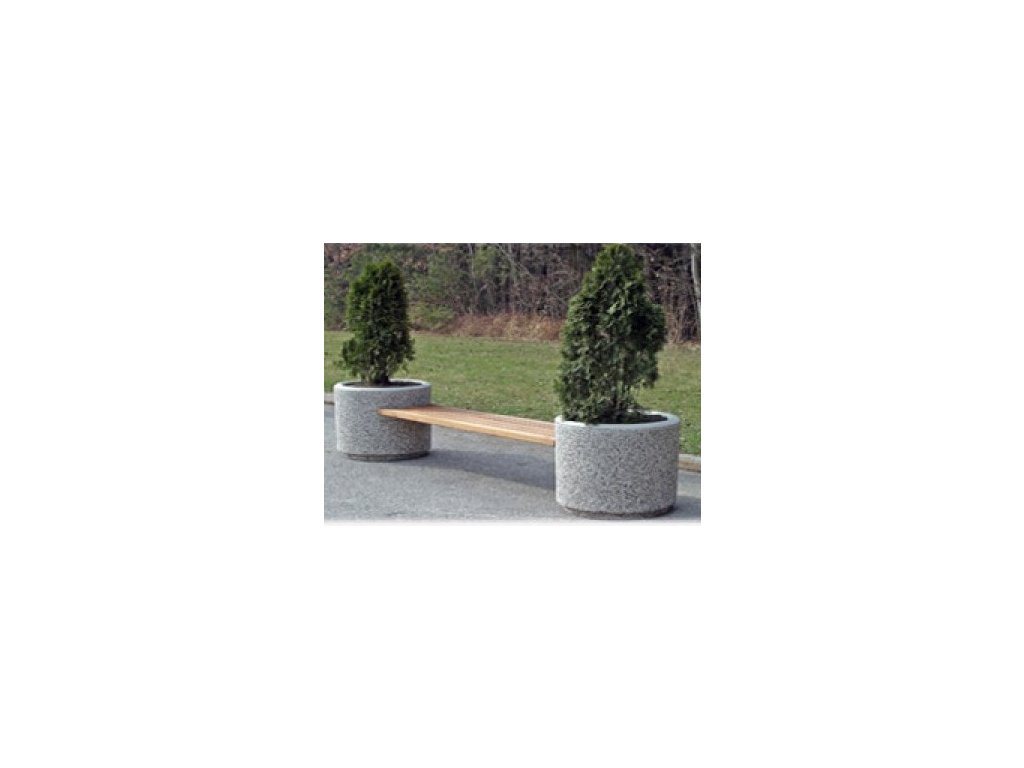 Banca fara spatar cu 2 jardiniere din beton armat placat cu pietre de rau si cu sezut din elemente de lemn.
