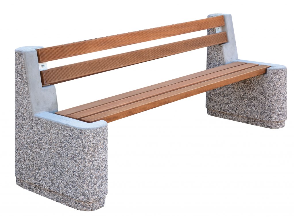 Banca cu picioare din beton. Sezutul si spatarul din sipci de lemn.