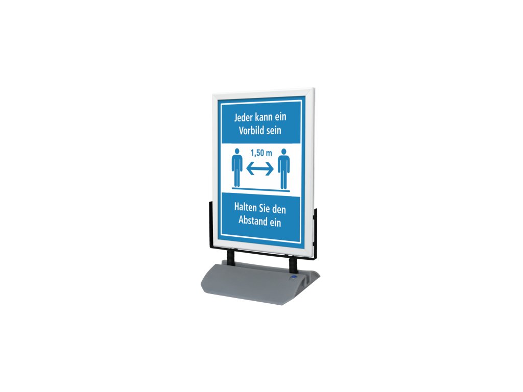 Construcție din aluminiu și oțel pentru panou format DIN A1. Profil cadru fix, 45 mm lățime. Stabilitate ridicată prin depozitare pe arcuri de oțel protejate împotriva coroziunii. Cadru din oțel vopsit in camp electrostatic negru RAL 9005. Baza de plastic poate fi umpluta cu apă sau nisip și are role. Panourile sunt din tablă de oțel zincat. Afisul are o protecție anti-reflectorizanta cu protectie UV.